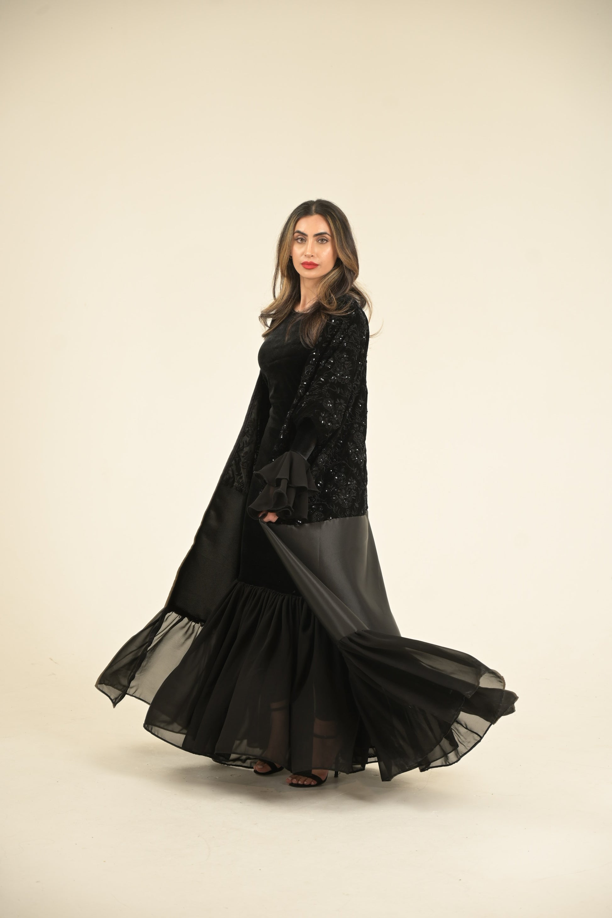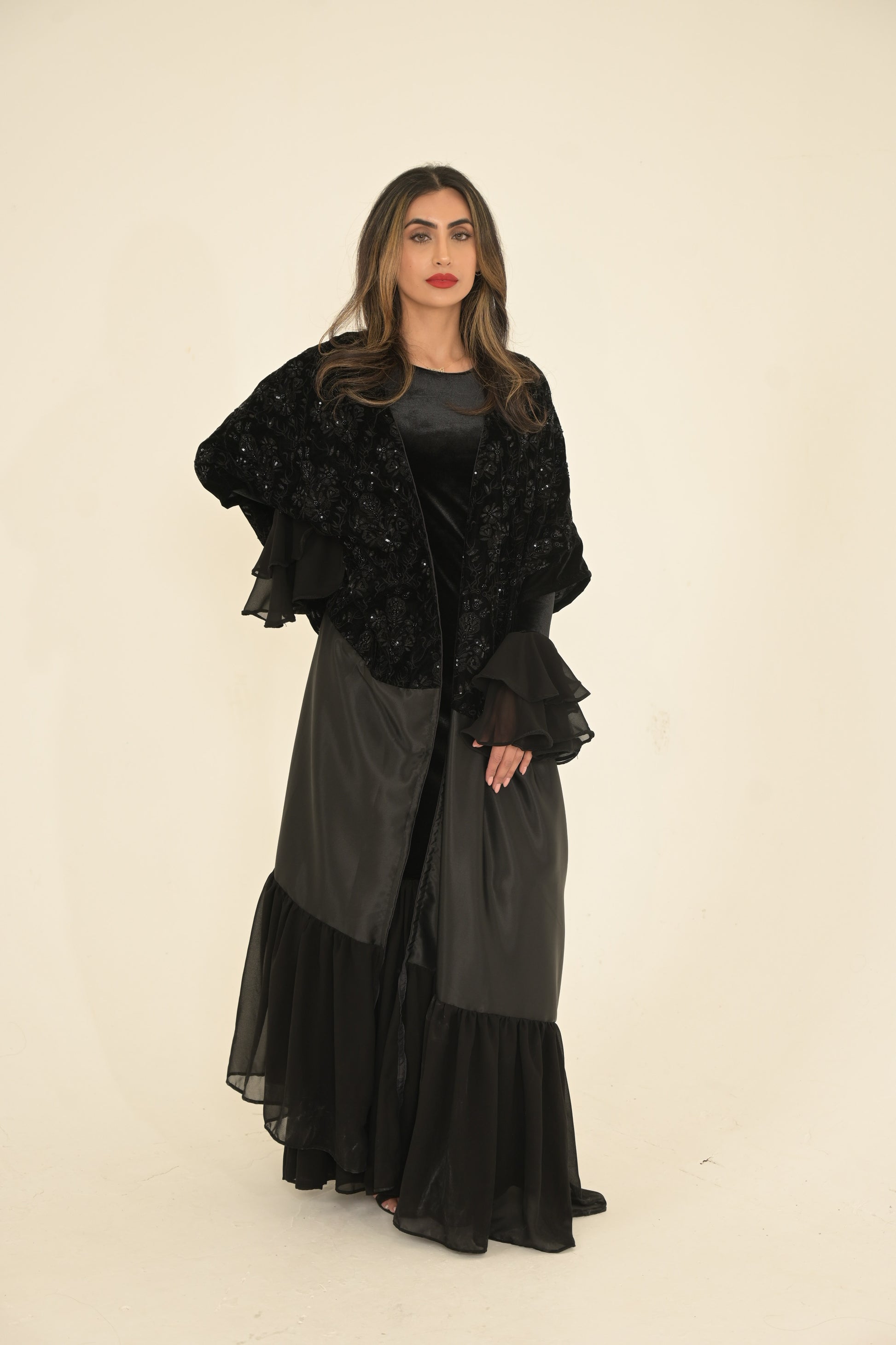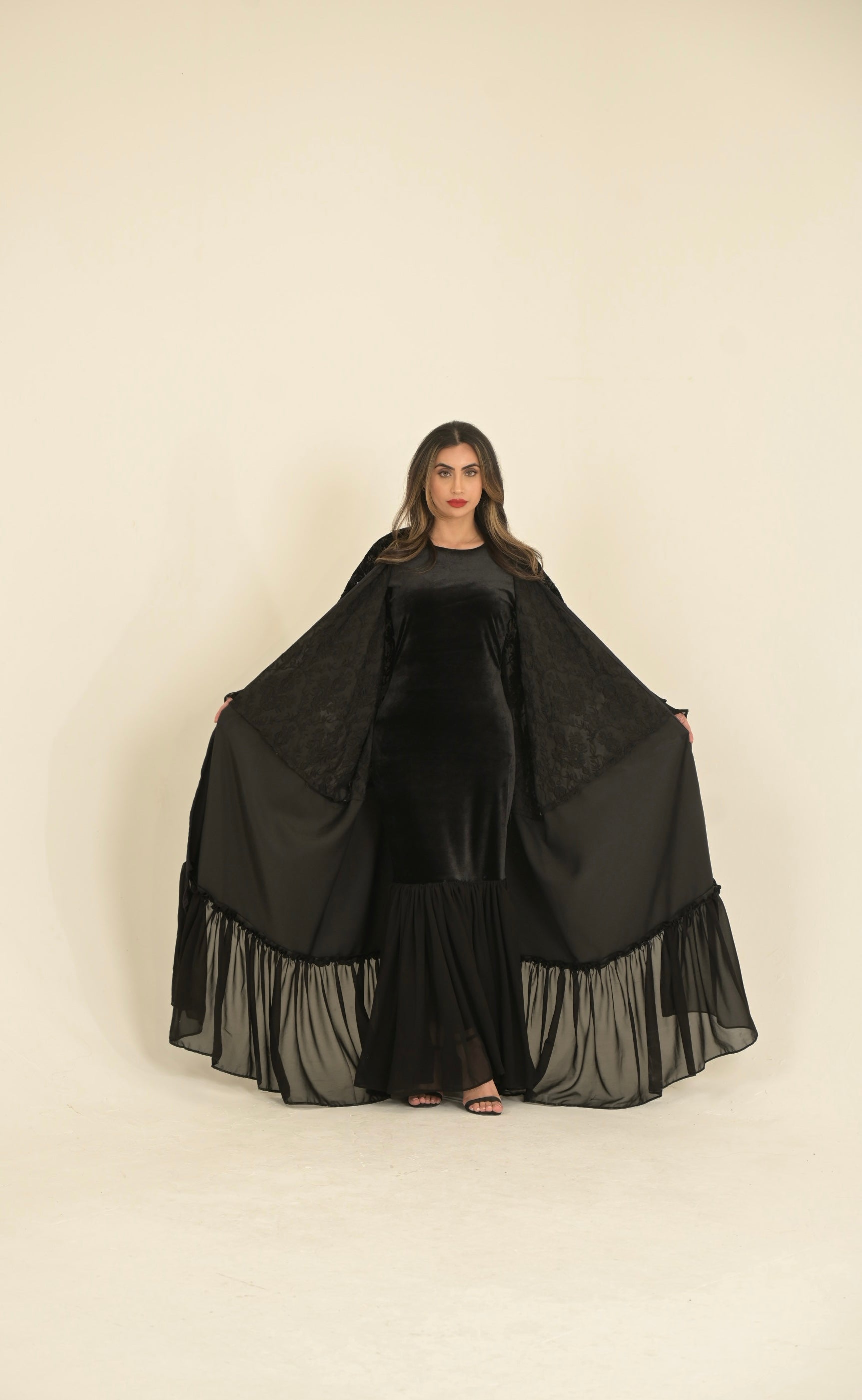 ( Princess Mary ) 2 pieces Abaya inside dress velvet and chiffon + main abaya Black velvet embroidered fabric, stain and chiffon
