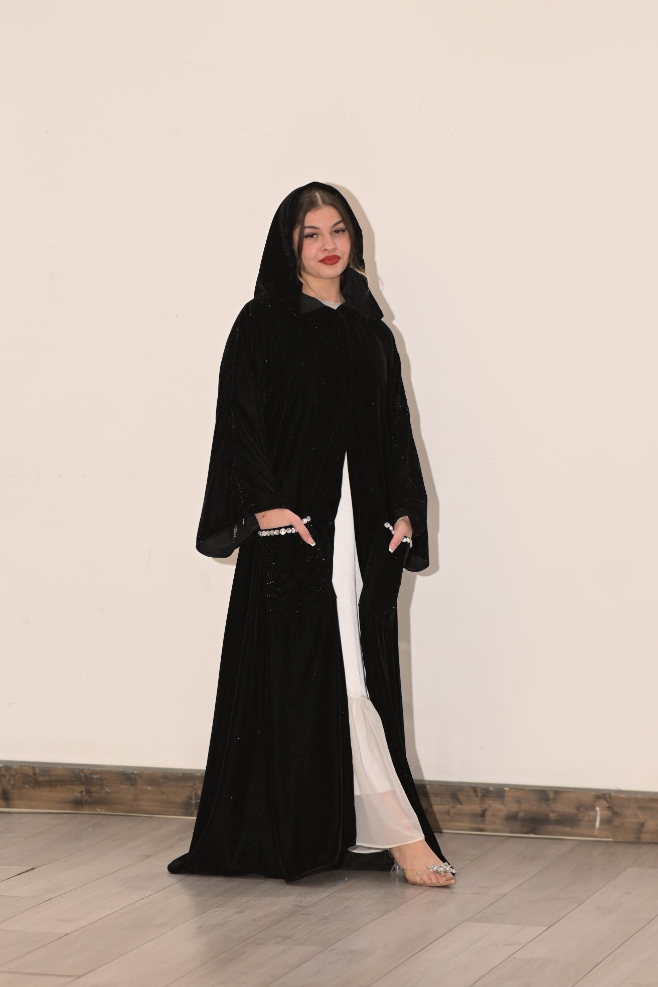 Black velvet hooded Abaya with pockets and Swarovski stones