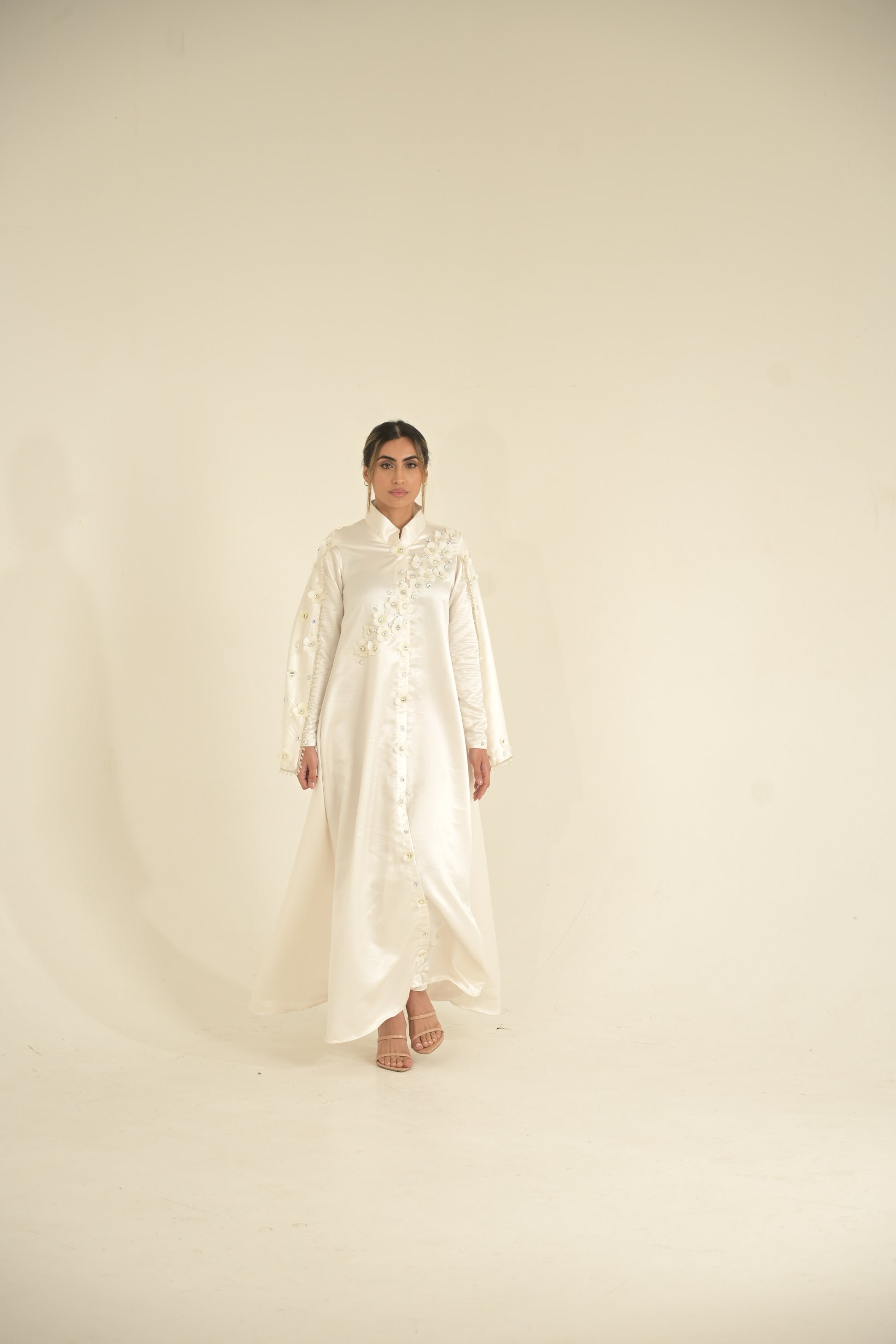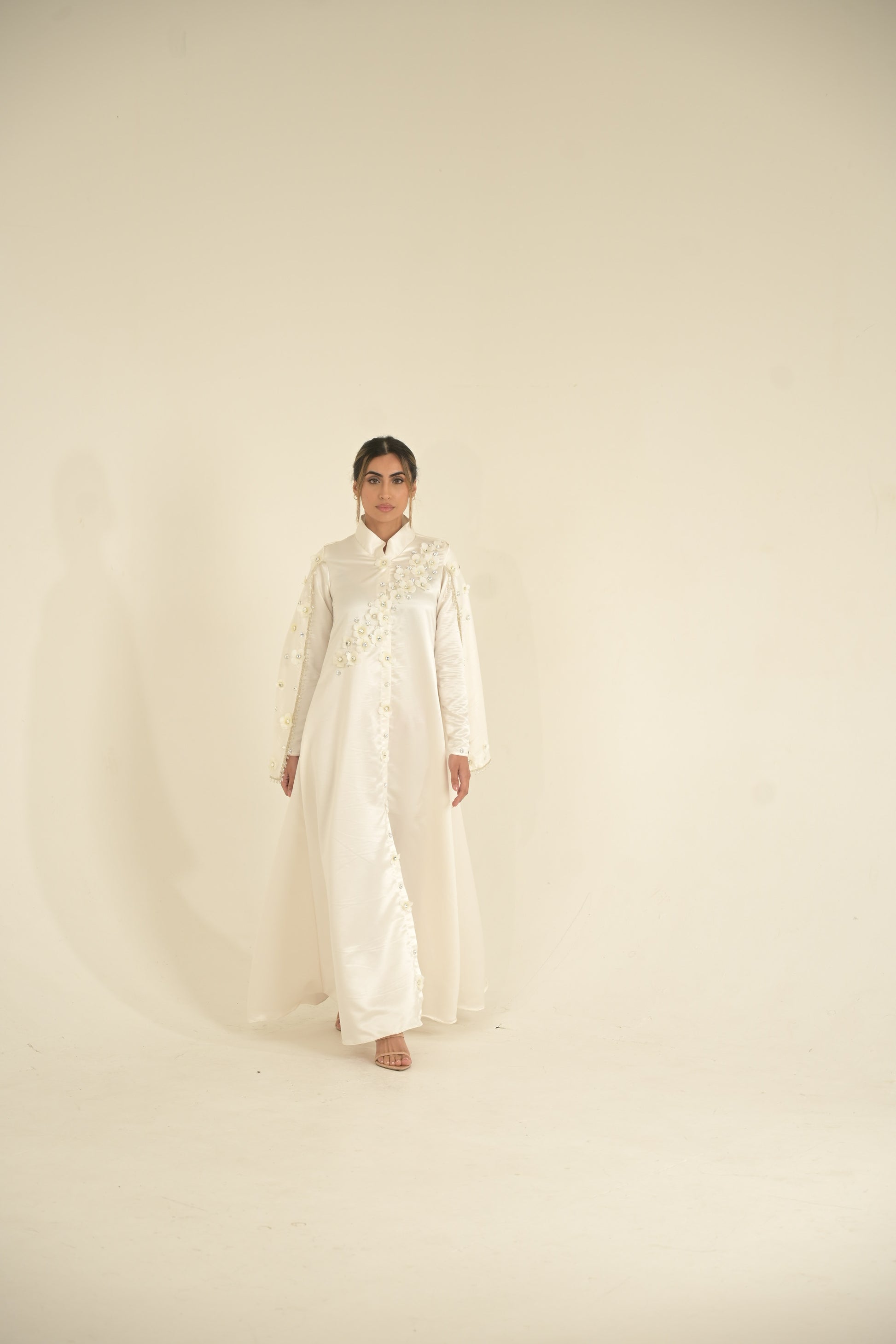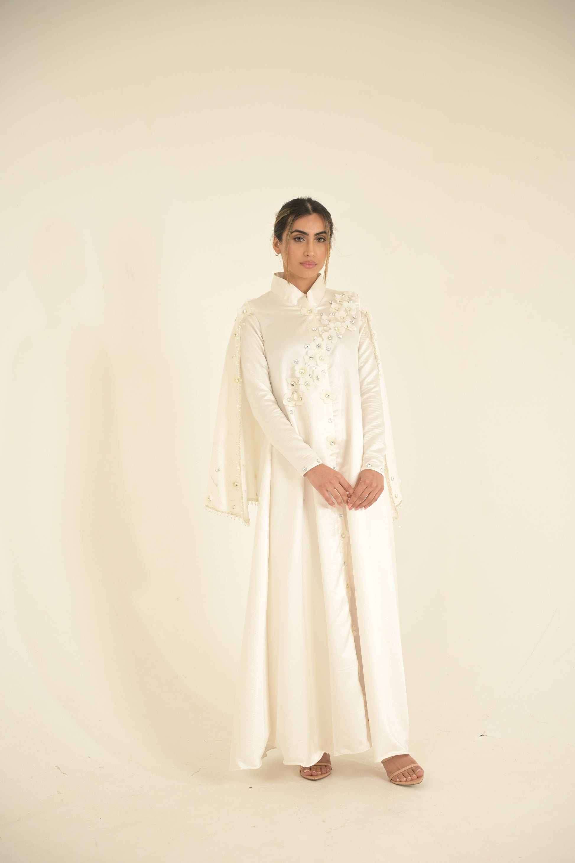 bridal White silk and 3-D embroidered Caped abaya