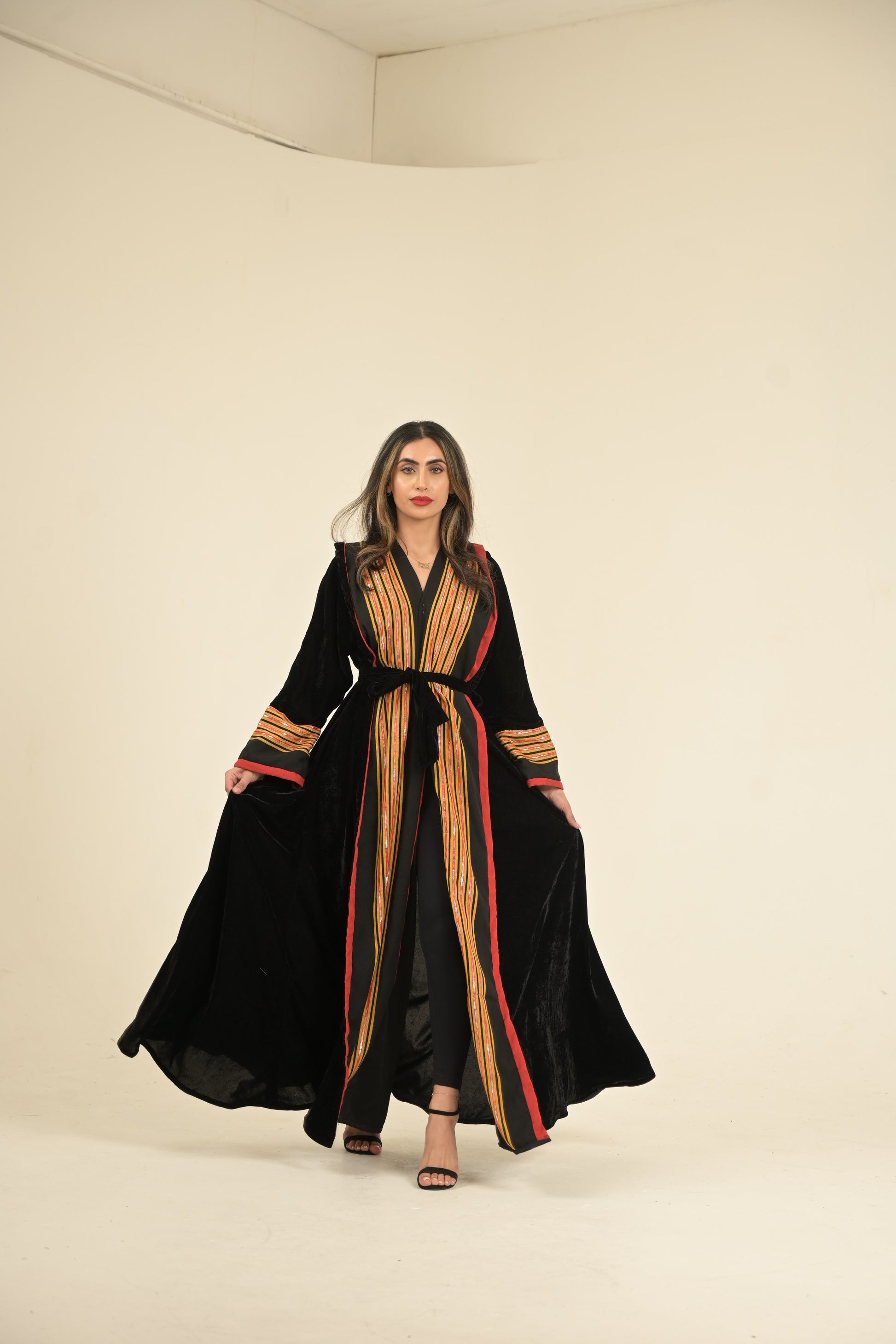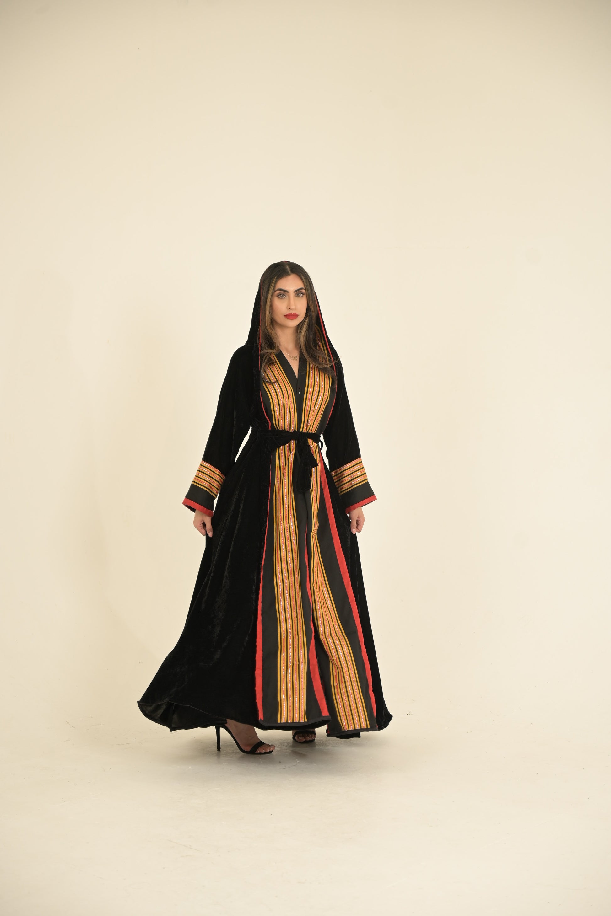 Yemeni traditional fabric with black velvet hooded abaya